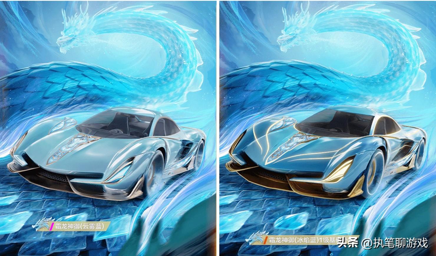 接下來我們來說“霜龍神御”,作爲跑車的載具類型,同樣是被光子設計出2個顏色,其中的雲霧藍是1個提車幣的普通款;冰焰藍則是3個提車幣的普通款。