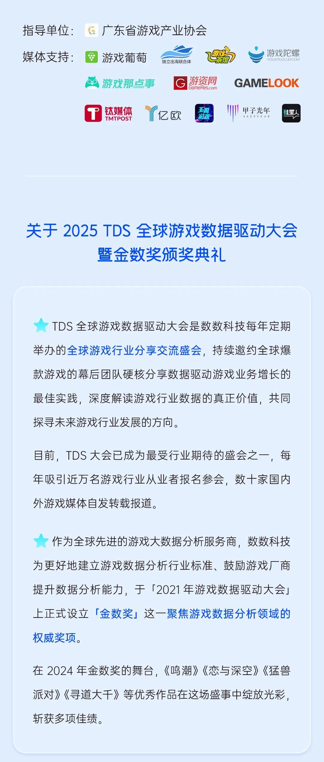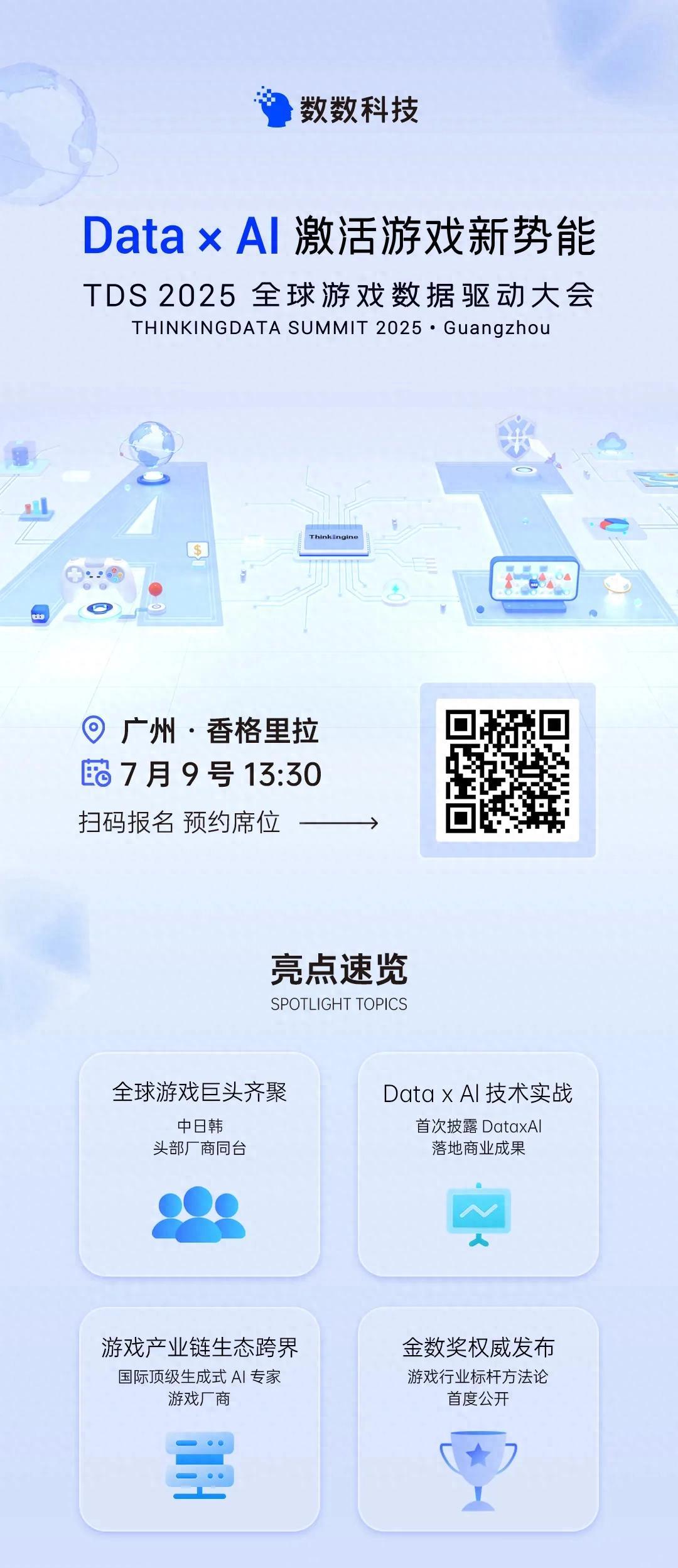 這條路會通向何方?發展機會究竟在哪?圍繞「Data x AI 激活遊戲新勢能」的主題,由數數科技舉辦的2025全球遊戲數據驅動大會(TDS)將於7月9日在廣州舉辦。屆時,來自中日韓頭部廠商的遊戲企業管理者和廣大遊戲人,將從多個賽道、不同視角出發,探討AIx遊戲的實戰應用,和未來潛力。