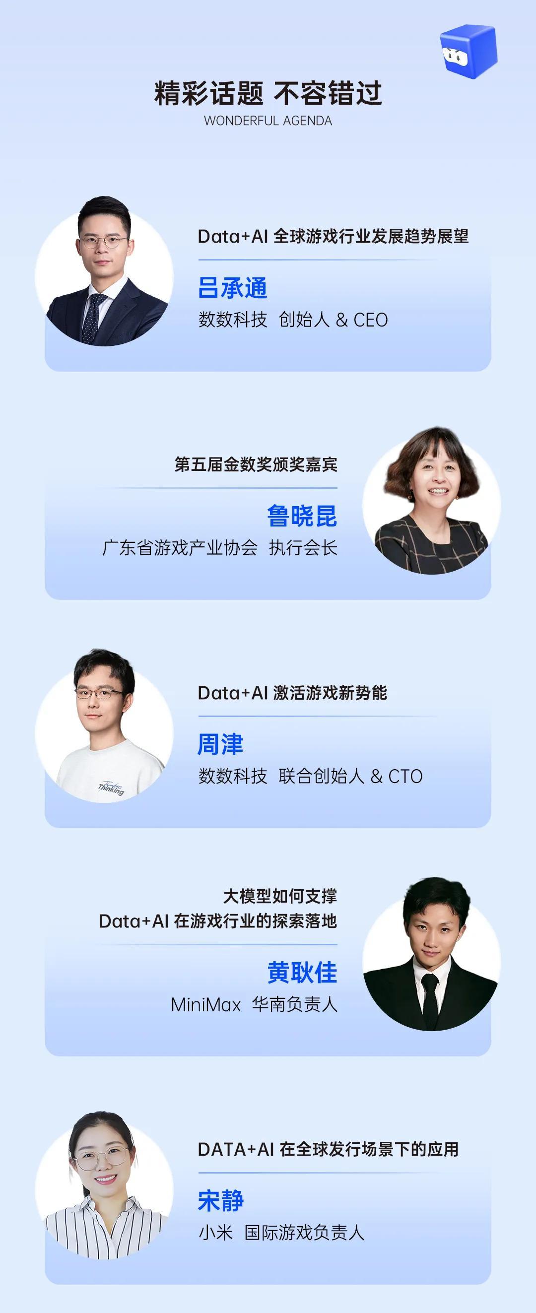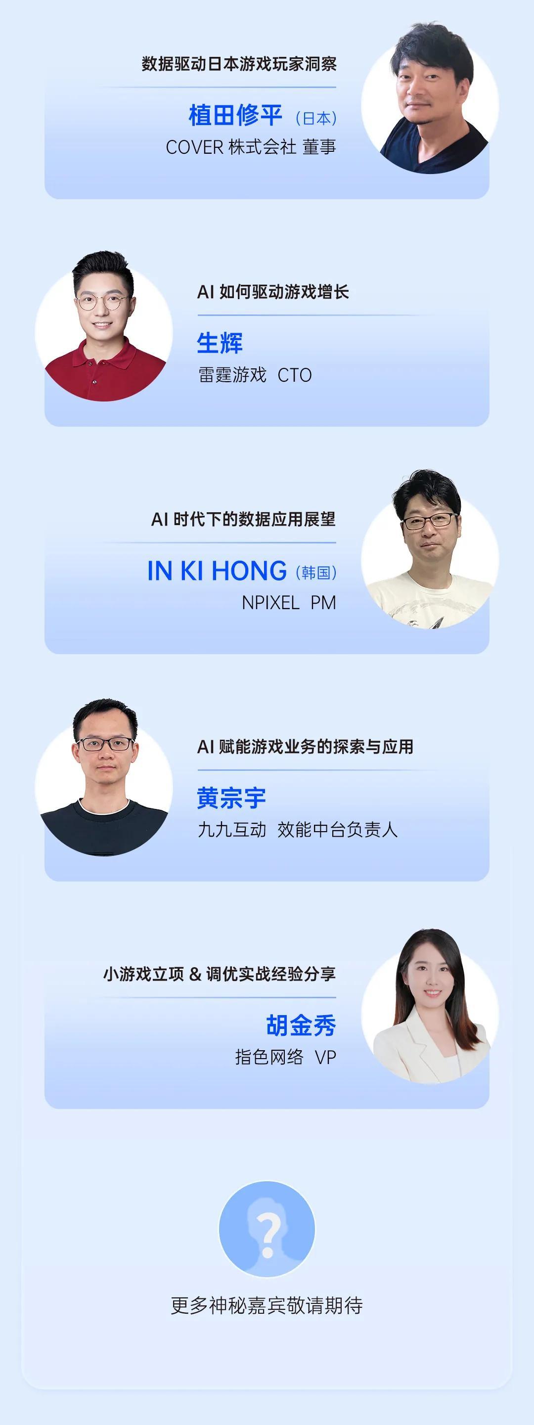 比如,雷霆遊戲CTO生輝,會聊一聊AI如何驅動遊戲增長;COVER株式會社(hololive開發商)董事植田修平,將從數據驅動視角探討日本遊戲玩家洞察;NPIXEL(《劍與騎士團》開發商)PM IN KI HONG,會詳解AI時代下的數據應用展望;指色網絡(代表作《看誰能通關》《超級解壓館》《天天釣魚》等)VP胡金秀,將分享小遊戲立項和調優的實戰經驗;小米國際遊戲負責人宋靜,將介紹DATA+AI在全球發行場景下的應用……