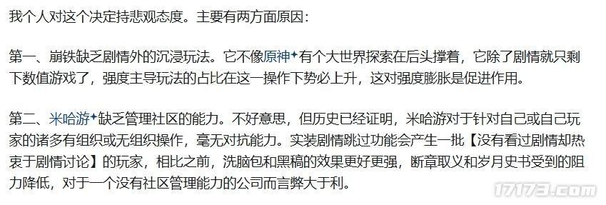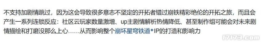 回到《崩鐵》,玩家們不滿劇情跳過的原因,主要集中在擔心有云劇情的玩家斷章取義;看劇情的人少了,人物塑造優秀但強度不高的角色賣不出去,會加重數值膨脹;以及擔心可以跳過劇情後官方寫劇情會不用心等。