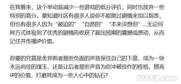 或許最好的選擇就是將跳過鍵交給玩家、把選擇權交給玩家,讓玩家自己選擇感興趣的內容體驗。