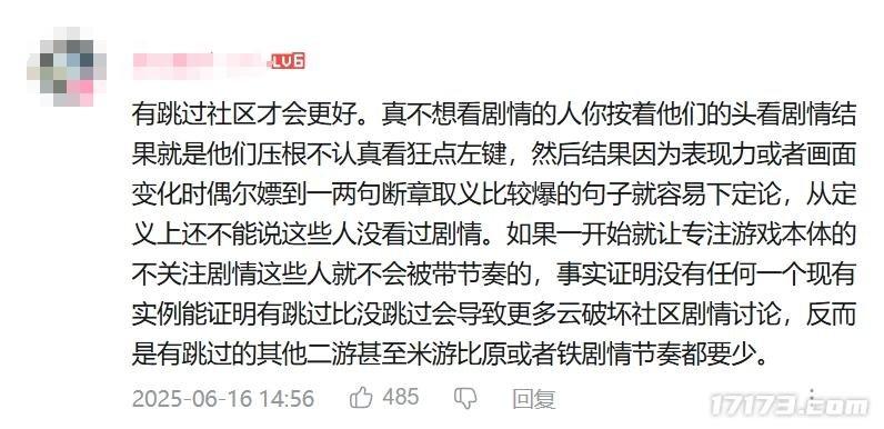 這些玩家的擔心有着一定道理,不過以其它二遊的情況來看,能跳過劇情反而可以讓對劇情不感興趣的玩家離開劇情討論,劇情黨與玩法黨各自安好,社區的劇情討論反而更加和諧。逼着不喜歡看劇情的玩家硬看劇情,只會讓人心生叛逆開始挑刺。