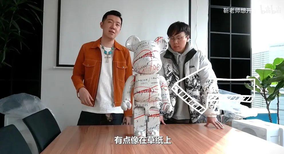 @靳老師想開了,是一個B站很靠譜的男裝UP主,他也會出一些潮玩相關內容。在2020年,他曬過一批自己的積木熊,其中有個與著名藝術家巴斯奎特的聯名款。