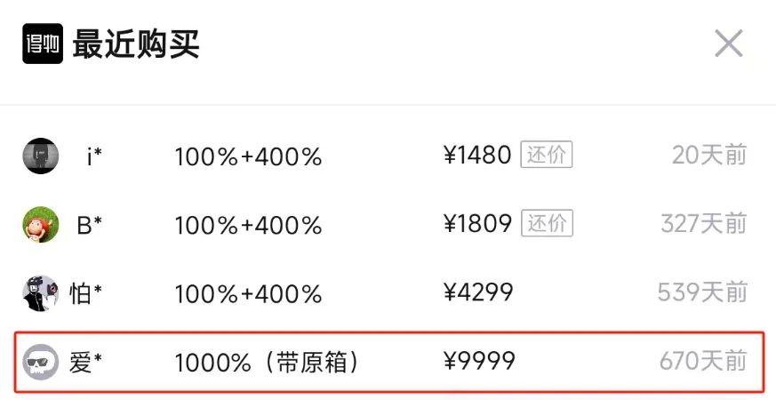 而2023年,同款在得物上的成交價,已經變成9999元,隨後再無成交記錄。相比之下,其100%與400%的捆綁款,2020年的最高成交價爲5000元,如今20天前,成交價爲1480元。