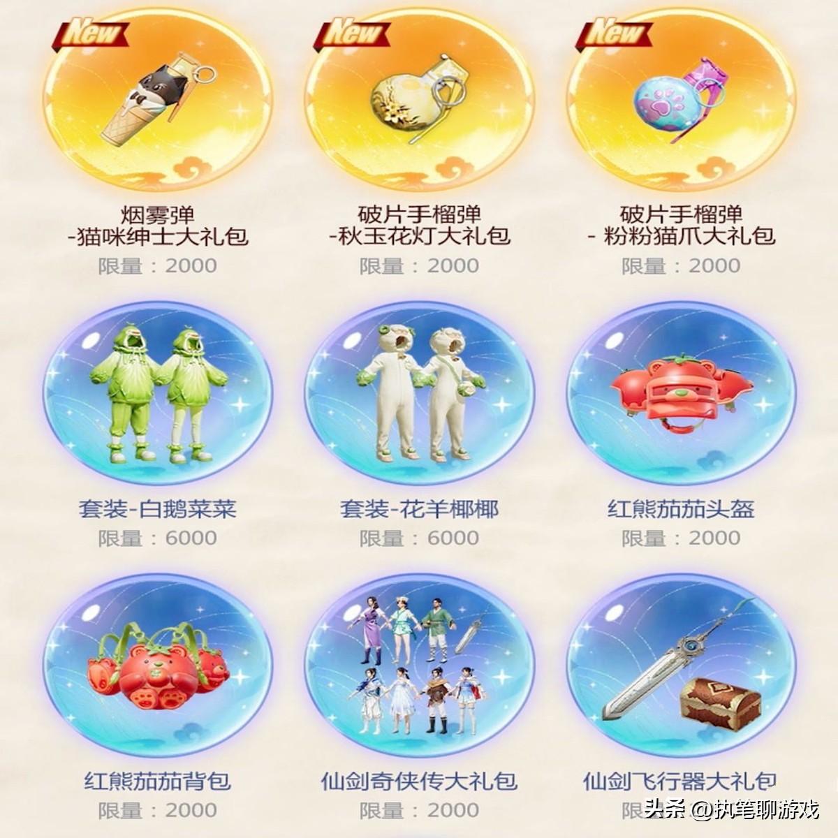 如圖所示,大禮包方面出現了仙劍系列、兔兔小魔女、初代小丑“怪誕喬克”;套裝方面有紅熊茄茄、白鵝菜菜、花羊椰椰等。