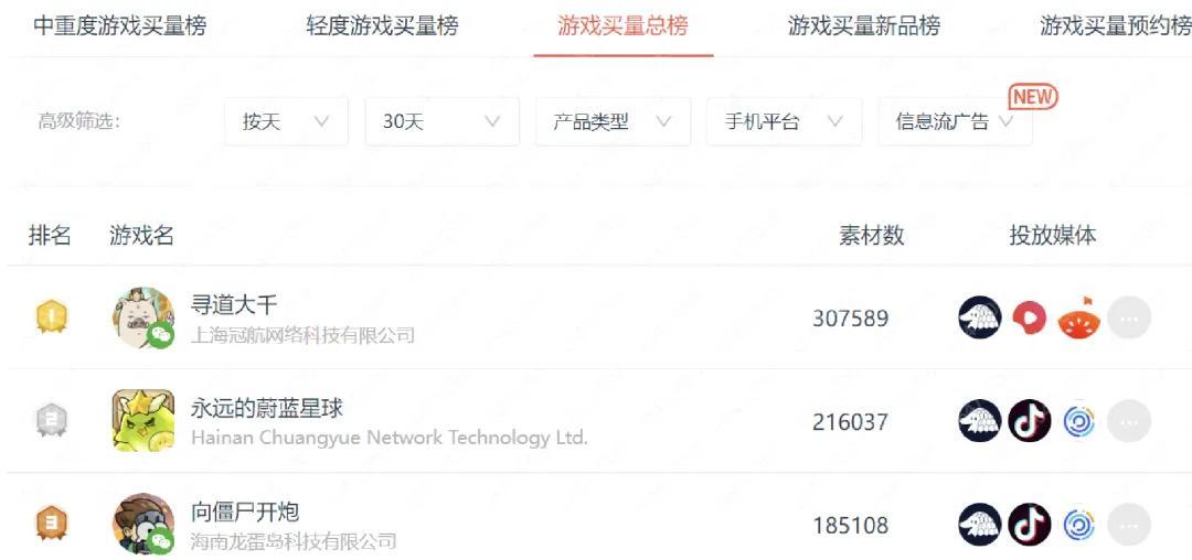 《藍星》上線前夕,詩悅和發行方9377就鋪開了大規模的廣告投放。ADX數據監測,《藍星》近30天的投放素材數超過21萬組,位列近30天素材總量榜第二名。