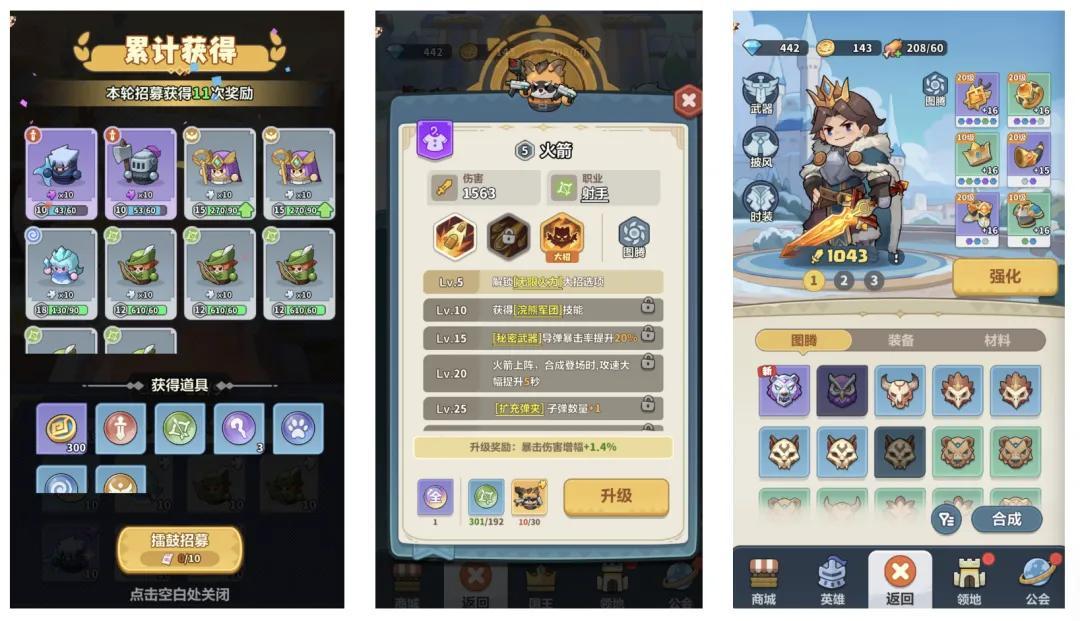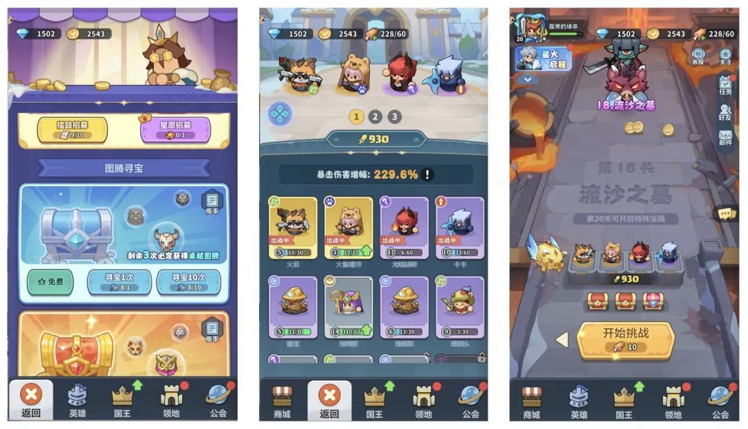 英雄則是Q版一頭身的設計,外形可愛又不失細節,且無論是局外展示,還是戰鬥場景,角色始終正面面朝玩家,有效地拉近了與玩家的情感距離。