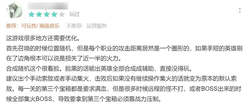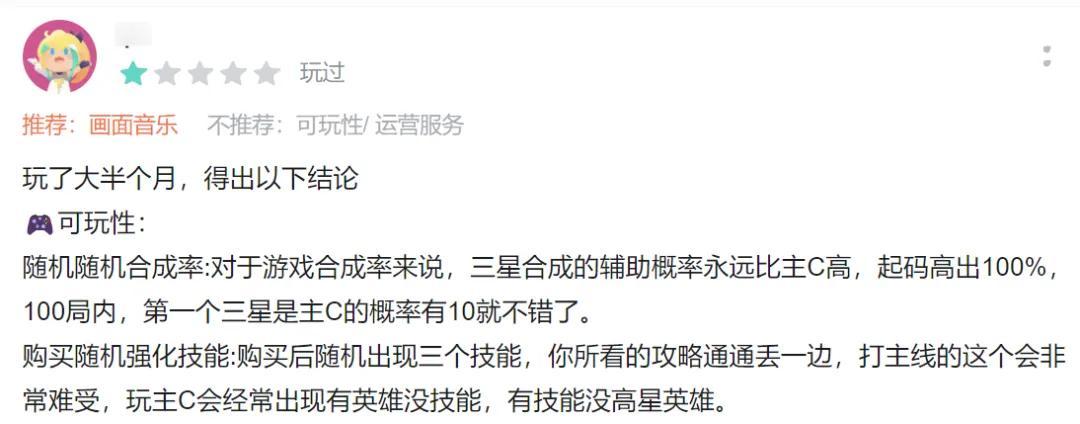 TapTap評論區的不少玩家,都描繪過自己的臉黑時刻。比如主C連續合成輔助、喫不到技能加持、近戰英雄合成了遠程、遇到了針對剋制的怪物等情況。