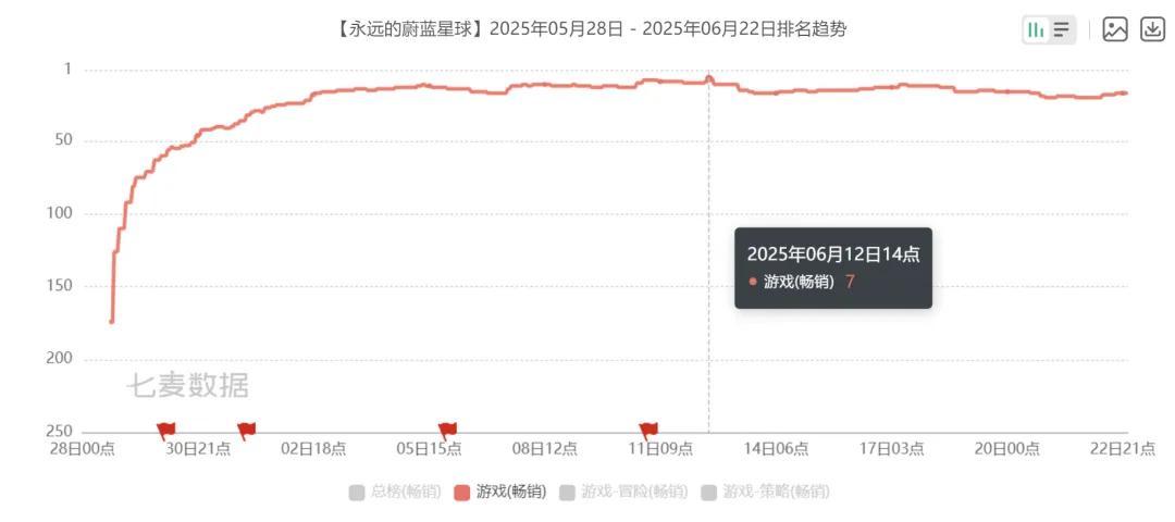 5月28日,詩悅網絡《永遠的蔚藍星球》(下稱《藍星》)上線。其暢銷榜排名在兩週內快速攀升,最高衝至iOS遊戲暢銷榜第7位。