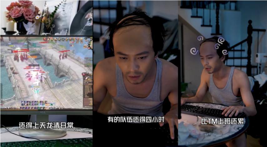短片裏那個哥們兒,頂着黑眼圈,一臉生無可戀地吐槽:“玩了十幾年的天龍,身體也垮了,天天晚上不睡覺,還得上天龍清日常……比上班還累!”
