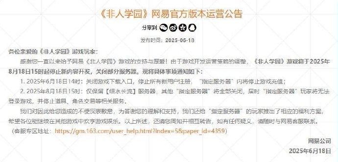 根據官方發佈的具體安排,從2025年6月18日14時開始,《非人學園》已經關閉了遊戲下載入口,並停止接受新用戶的註冊及充值服務。而到了8月18日15時,除了保留名爲“細水長流”的服務器外,其餘所有指定服務器都將被正式關閉,屆時玩家將無法登錄遊戲進行遊玩。