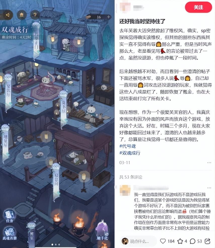 回想去年風波最烈的時候,《如鳶》社區的狀態很典型:批評的聲浪巨大且具有一邊倒的態勢,形成了一種無形的“洪流”——讓那些內心覺得“指控可能過頭了”、“事情未必如此”的玩家,感到猶豫和孤立無援。他們不確定有多少同伴和自己想法一致,害怕被無差別的指控,更擔心貿然發聲會被貼上“洗地”、“無視問題”甚至更惡劣的標籤,於是她們選擇了暫時沉默。結果,負面敘事看起來成了“唯一的真相”,誤解被不斷放大,甚至被扣上一些莫須有的、極具傷害性的“帽子”。這種“被誤解”、“被污名化”的感覺,其實早在大量玩家心中憋着一股勁兒,越積越深,她們一直認爲:“真相不該被淹沒在情緒化的罵聲裏”。
