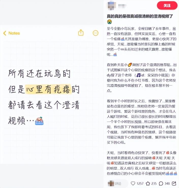 面對去年底風波中堆積的誤解和可能存在的惡意扭曲,他們沒有選擇沉默或隨波逐流,而是主動站出來努力尋找和披露真相。在每一個仍被誤解的角落,玩家們依據事實耐心溝通解釋,盡己所能,努力進行“認知糾偏”。有人制作超30分鐘、邏輯清晰完整的深度澄清視頻,有人積極轉發擴散,只爲讓紮實的真相穿透“迴音壁”,觸達更多可能被矇蔽的雙眼。她們自發的撥開人爲製造的“迷霧”,讓事實本身得以顯現,讓同好們乃至更廣泛的圍觀者,不被虛假信息所欺騙和誤導。