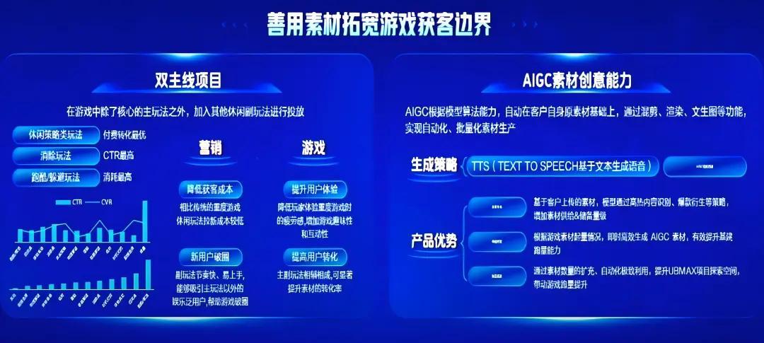 以前巨量引擎的廣告模型更多是對用戶特徵去做學習和探索,對遊戲素材缺乏理解。但在投放系統升級之後,廣告模型能自動從客戶的廣告計劃中篩選出熱度比較高,有機會起量的素材,然後通過AIGC去實現自動化的生產——包括重新二次剪輯,插入新的劇情素材等等。