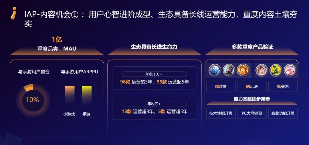 在大幅增長的增速之外,有一個數據更加誇張:重度遊戲品類的MAU已超過1億,但其中與手遊用戶的重合度僅有10%,而二者的ARPPU幾乎持平。這意味着,對重度品類來說,小遊戲相當於一個全新的第二曲線。