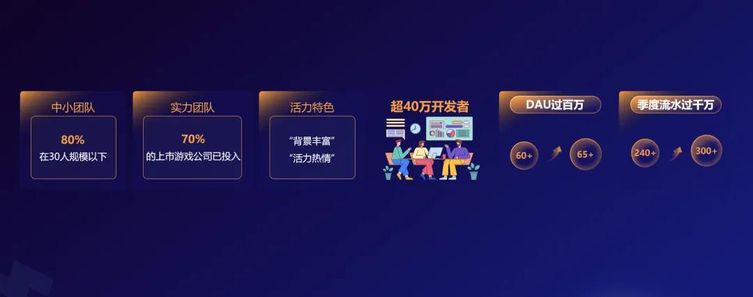 其次是開發者層面。會上提到,微信小遊戲累計服務的開發者數量超過40萬,其中80%都是不足30人的中小團隊;而在上市遊戲公司中,超過70%的廠商都已入局微信小遊戲。