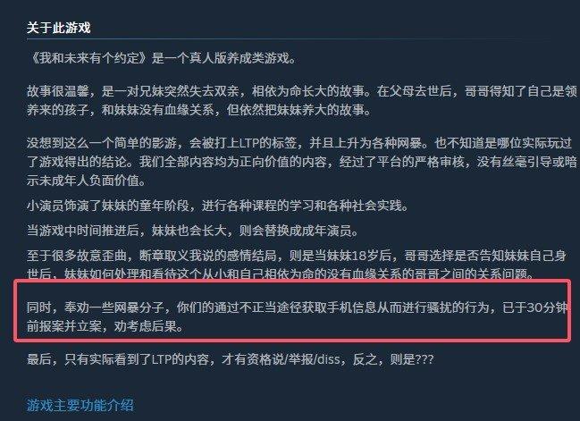 作爲Steam平臺一款真人互動養成遊戲,《我和未來有個約定》中玩家以哥哥身份撫養10歲女童長大,角色由真實女童出演。目前該遊戲陷入了倫理爭議,起因有兩方面,一是遊戲可能包含未成年人出鏡風險。女童真人形象被置於虛擬養成系統中,玩家通過操控其生活學習、打工等積累“好感度”,引發對兒童被“凝視”和物化的擔憂。