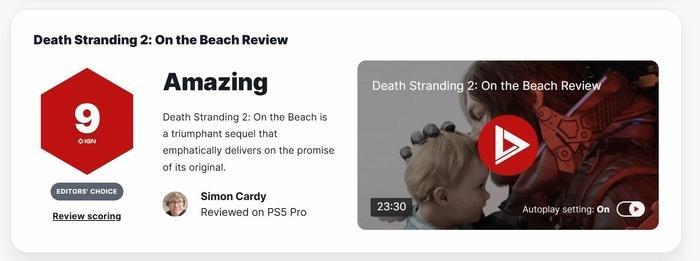 有意思的是,《死亡擱淺2:冥灘之上》媒體評分正式解禁!當前該作在M站的評分爲91分,獲得了“必玩認證”圖標,共有49家媒體給出了評價,其中IGN給該作打出9分,而其前作《死亡擱淺》僅獲得6.8分。