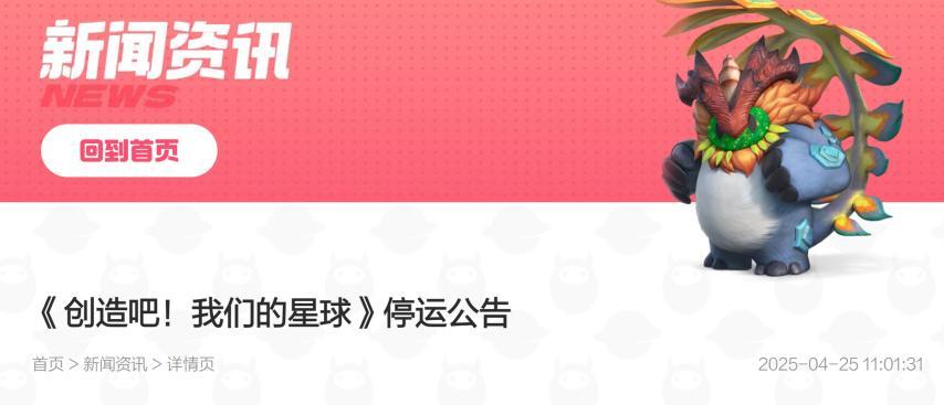 2025年4月25日,騰訊旗下太空開放世界手遊《創造吧!我們的星球》官方發佈停運公告,宣佈將於6月27日正式關閉服務器。該作於2024年6月26日上線,遊戲玩法與爆火的《幻獸帕魯》一致,憑藉高自由度玩法吸引不少玩家。