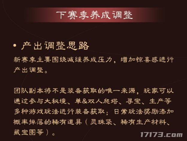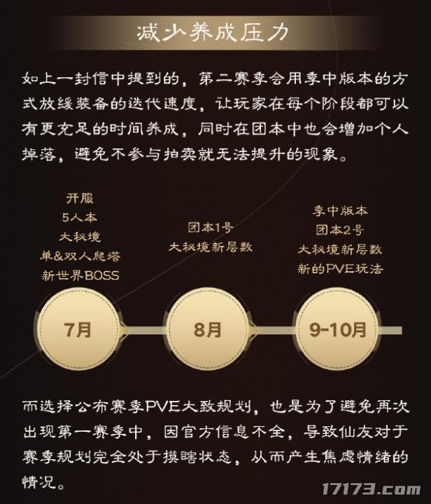 其中,就包括按照《最終幻想14》、《魔獸世界》那樣的賽季更新模式,將一個賽季分爲“前、中、後”三個階段,逐步上線新玩法與新內容,並開放大祕境、單&雙人爬塔等新渠道,讓不願打團的玩家也能快速畢業。