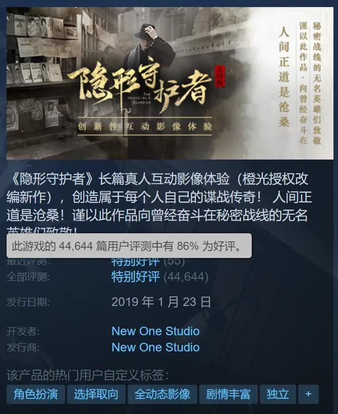 說起New One Studio,就繞不開《隱形守護者》。這款2019年初上線的作品,憑藉電影級的畫面,以及可遇不可求的劇本,在Steam上獲得了4萬+評價,至今仍維持着86%的特別好評,算得上是互動影遊品類天花板。