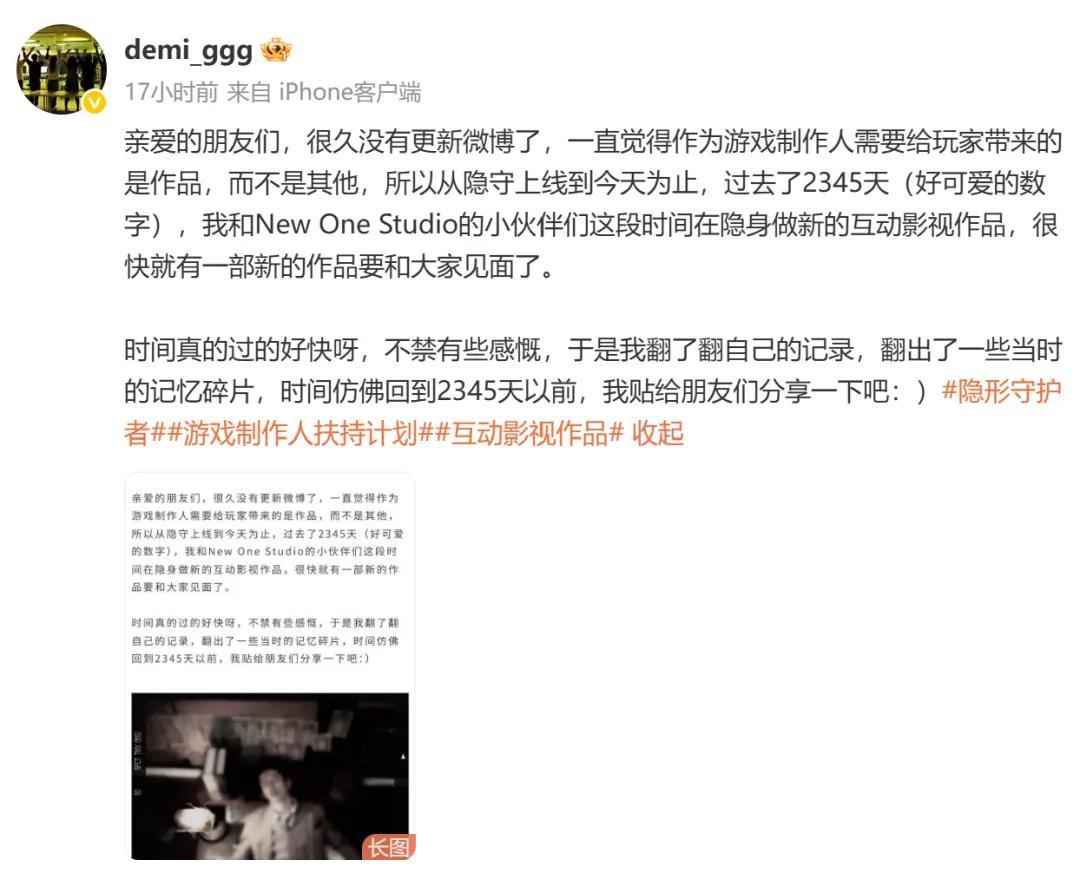 在《盛世天下》首曝前一天,Demi回顧了《隱形守護者》的開發歷程,並對新作進行了預告