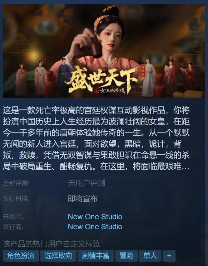 商店頁簡介顯示,《盛世天下》在敘事上以武則天的生平爲原型。玩家將扮演這位傳奇女性,從初入宮廷的懵懂少女開始,一步步走向權力中心。在這個鬥智鬥勇的過程中,你需要決定是拉攏盟友,還是剷除異己;是向權臣低頭,還是將他們收爲己用。