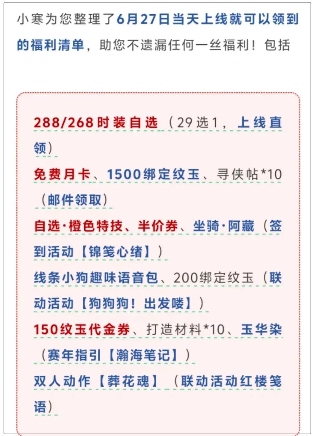 以及今天6月27日,兩週年版本上線當天,玩家就可以直接領取到288時裝自選、免費月卡、半價券、語音包等一系列福利,統統無門檻免費送。