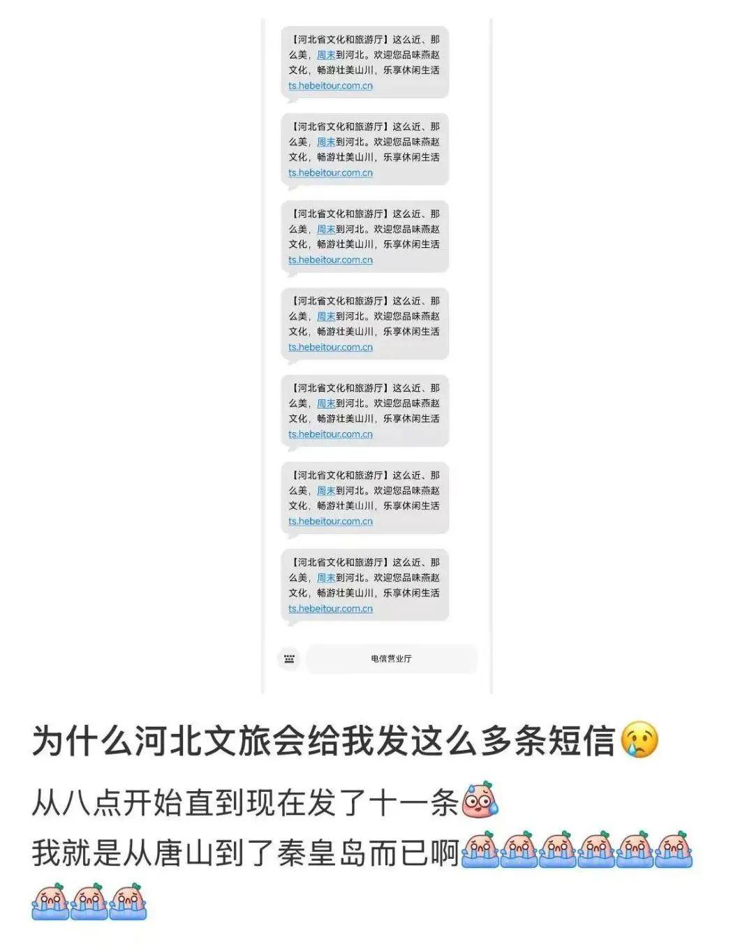 他們說,“在河北喘口氣都能收到文旅短信轟炸。”即使你只是在省內移動,也會被它標記爲潛在遊客,每經過一個地級市就會給你發一條信息。