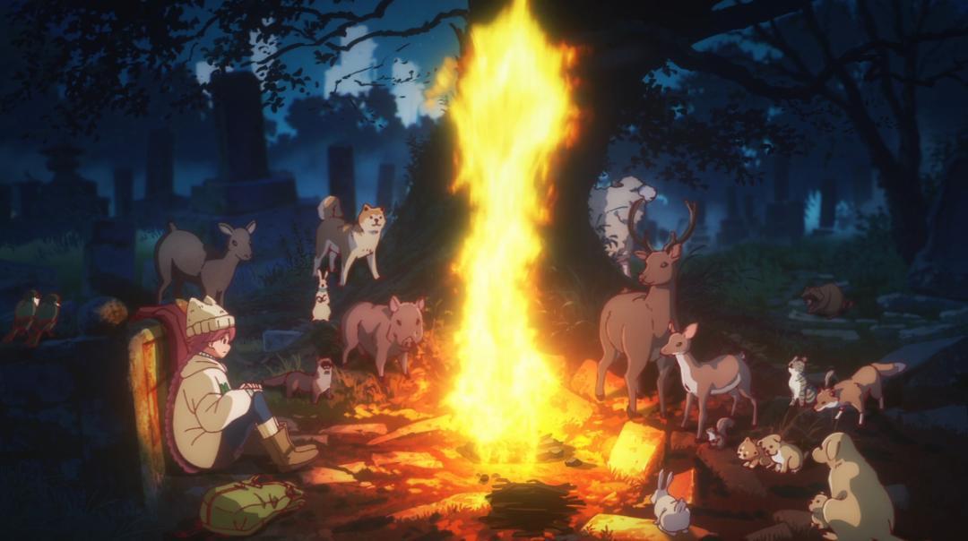 遠行的八千代在墓地休息。她用打火石點燃篝火,小動物被火光吸引留在她的身旁。