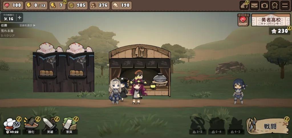 這種風格極具辨識度,也影響了他們的第二款作品《勇士食堂》。這款遊戲把視線聚焦到「深夜忍不住喫夜宵」的場景上,用「冒險狩獵-材料收集-製作和烹飪-強化戰力-外出冒險」這個循環,構建了一個偏休閒的模擬經營+RPG遊戲。