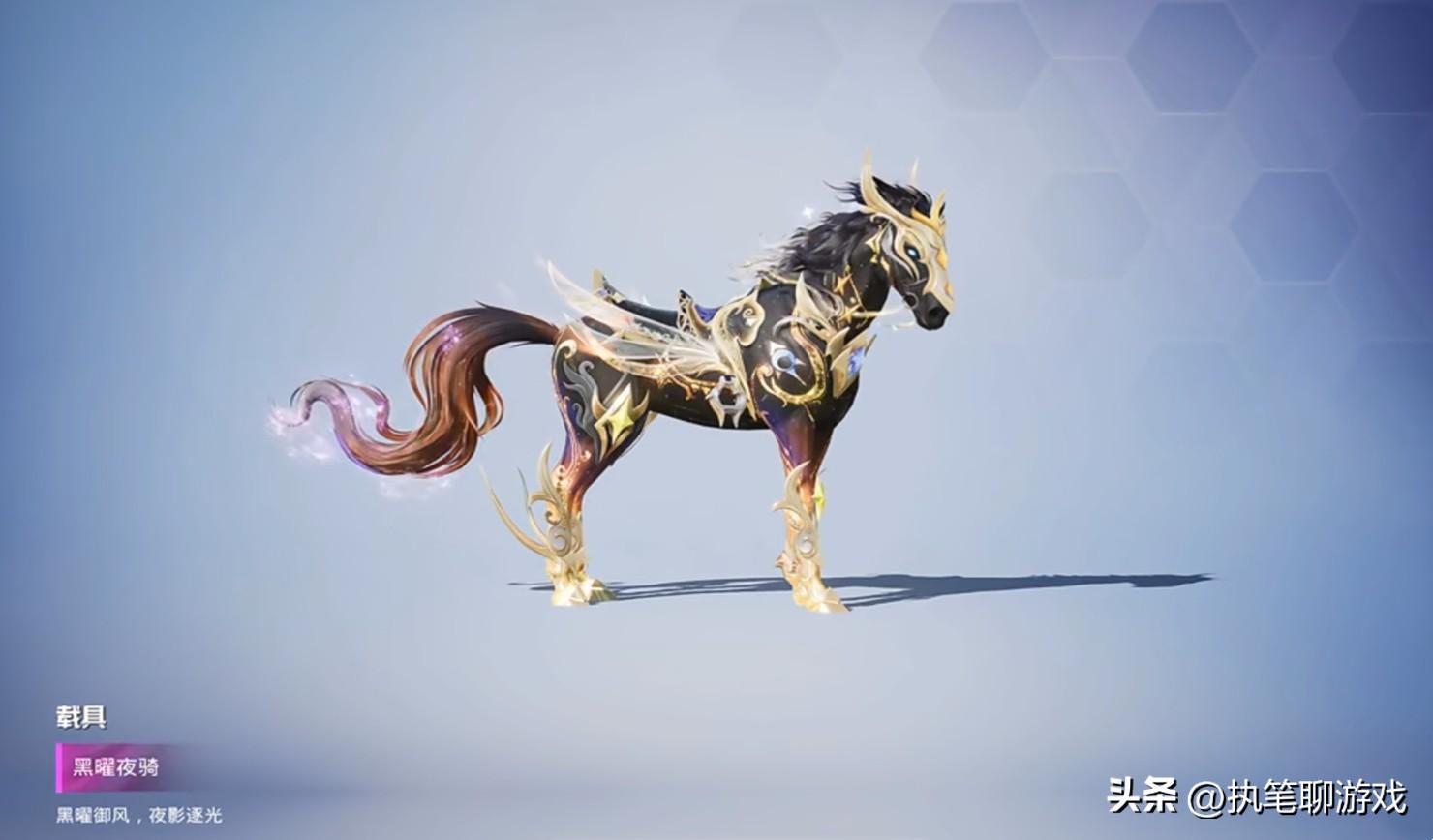 從外觀來看的話,“黑金馬”以黑色爲主,金色爲輔,馬蹄鐵、頭飾均爲金屬質感,而且還是“金光燦燦”,馬鞍也進行了特效材質的處理,金色的小翅膀相當酷炫。