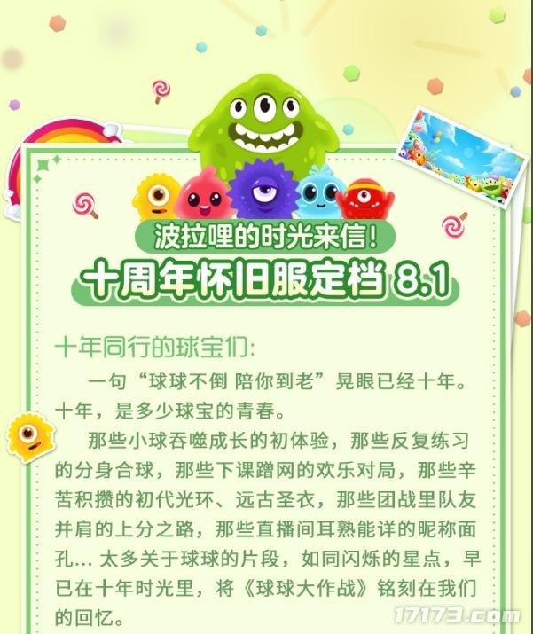 7日3日,由巨人網絡開發的《球球大作戰》正式宣佈,十週年懷舊服定檔8月1日推出。懷舊服將以2016年核心版本爲基礎開發,在遊戲內推出不需要額外下載客戶端,只保留團戰模式、生存模式和自由模式,且還原最初手感設定。