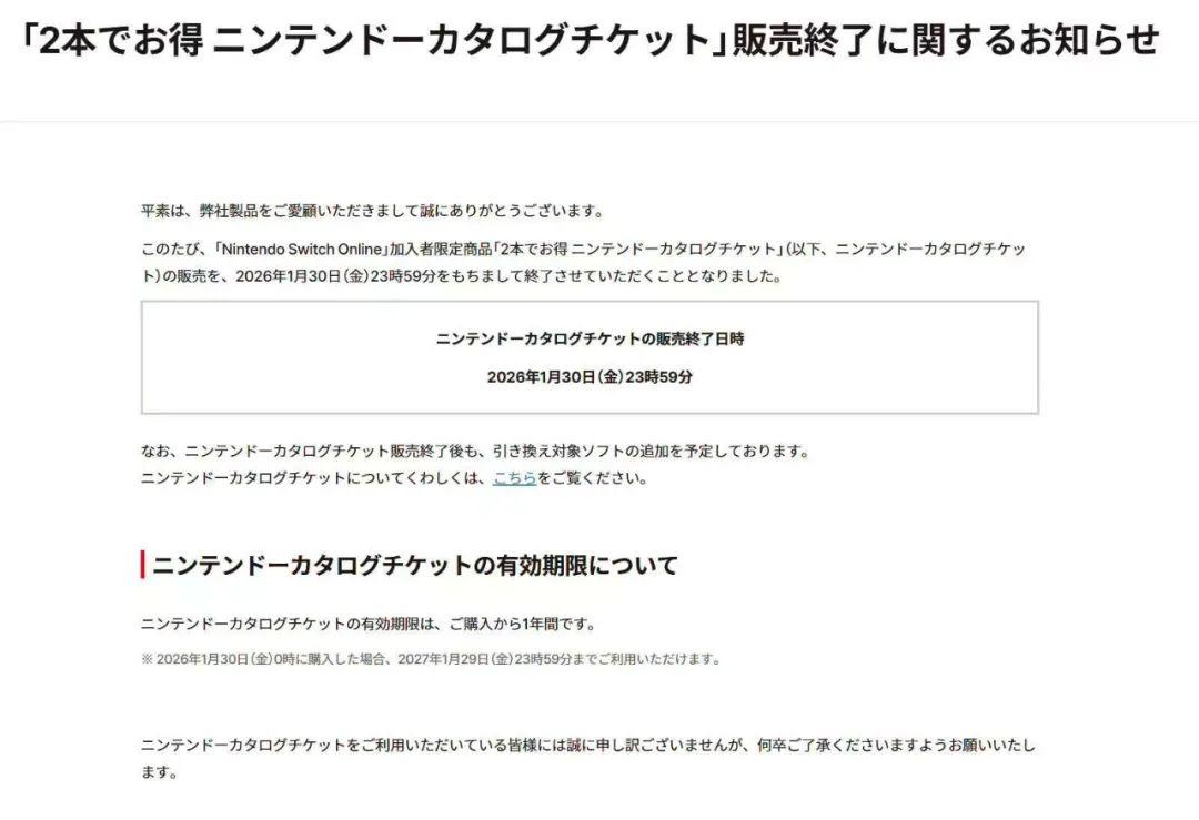 任天堂發公告稱,“任虧券”將於2026年1月30日,正式停止售賣。在這個日期前購買的券,會有一年的有效期。