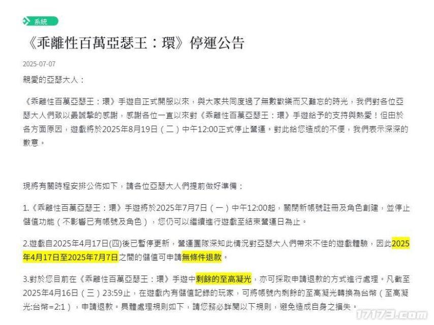 近日由SE授權,完美世界子公司艾玩天地運營的《乖離性百萬亞瑟王:環》國際服宣佈,遊戲將於2025年8月19日停運。