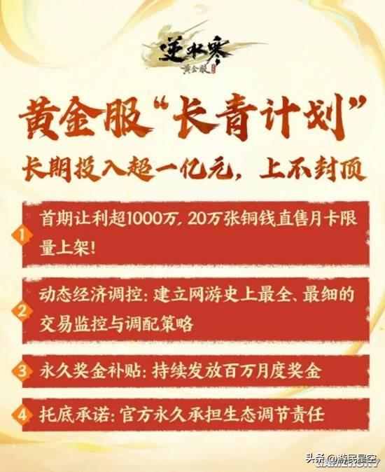 而在此之前,《逆水寒》推出了史上最大手筆的生態保障政策——“長青計劃”,長期投入預計將超過一億元,上不封頂,用於維護黃金服穩定運營。