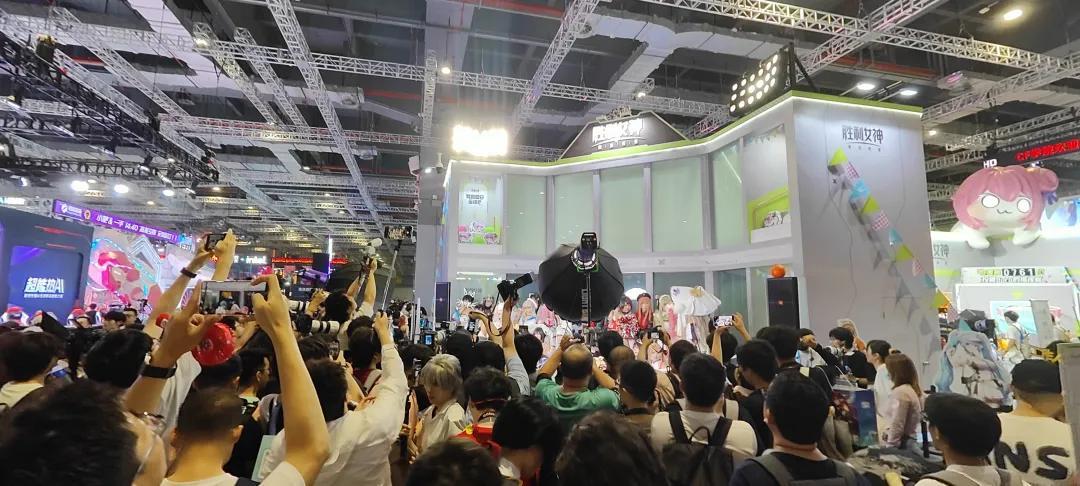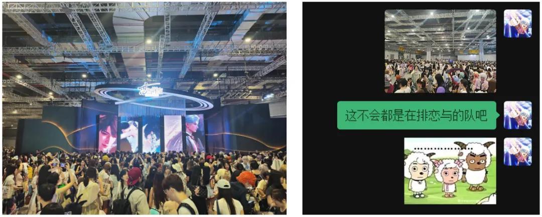 一些女性向遊戲的展臺,或是與女性向有關的舞臺活動周圍,更是被圍得裏三層外三層。比如在《戀與深空》這裏,彙集的女玩家可能有上千位。這本來已經夠震撼我了,結果轉頭一看……這好像還只是其中一部分而已。