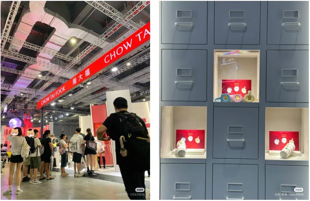 比如有的展臺用大喇叭宣傳抽獎,有的設置了小遊戲。優酸乳的展臺因爲邀請了卡琳娜,周圍也被高舉手機的人們團團圍住;而我第一眼看到時,不太理解爲什麼會出現在這兒的周大福,實際上也帶來了與《黑神話:悟空》、Chiikawa等IP合作的聯名金飾。