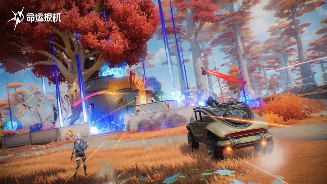 遊戲有二次元感的地方也不止角色技能。比如說載具方面,遊戲中有一款復古美式小轎車,看似平平無奇,卻能在關鍵時刻“懸浮變形”,收起輪子跨越複雜地形障礙。這一設計剛好契合了遊戲的核心舞臺——由三座地形崎嶇、落差巨大的浮空島構成的主地圖。懸浮車則成爲連接破碎地形的關鍵紐帶,極大提升了地圖探索與戰略轉移的效率。