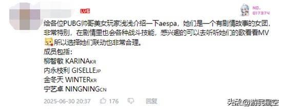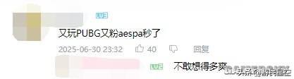 不久前,《PUBG》正式官宣了與aespa的合作聯動。毫不意外,官方公告一出,很快便吸引來了aespa的粉絲們。評論區下,不少粉絲紛紛給玩家們介紹團中的每一位愛豆,安利自己的“寶藏女孩”;亦不乏既玩《PUBG》又粉aespa的玩家,直呼“雙廚狂喜”......