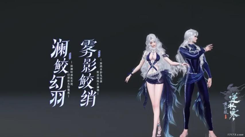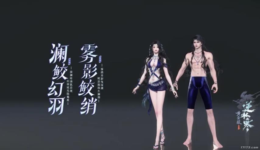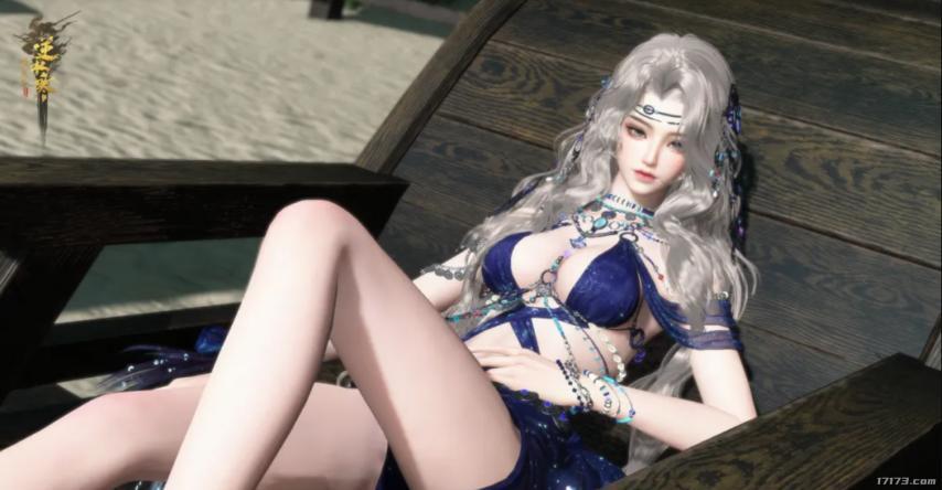 女角色的這套泳裝,銀白長髮搭配深藍系服飾,輔以大量精緻飾品,將 “鮫人族” 的神祕與美豔拉滿。海浪紋理、星光點綴,在沙灘場景中確實營造出 “海上冷豔女神” 的氛圍感,建模細節也延續了逆水寒一貫的高水準。