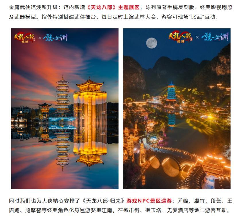 不僅把景區的金庸武俠館給煥新升級了,還安排了遊戲裏的喬峯、段譽、虛竹、王語嫣這些NPC,直接在景區裏巡遊,跟遊客互動。