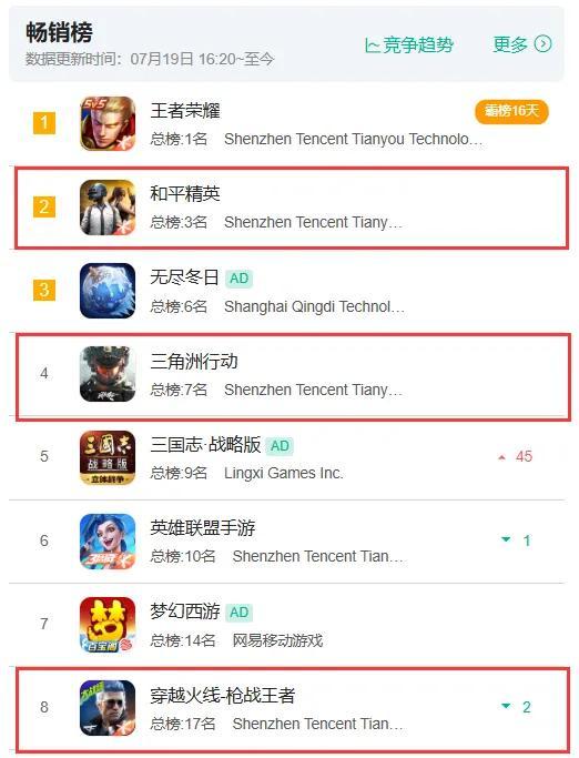 比如,目前手遊iOS暢銷榜Top 10當中,就有《和平精英》《三角洲行動》《穿越火線》三款射擊遊戲在列。需要注意兩點:一、它們都出自頭部大廠的手筆;二、它們都是從一衆強有力的對手當中廝殺勝出的,三、幾乎在每個細分方向上,都是贏家通喫。