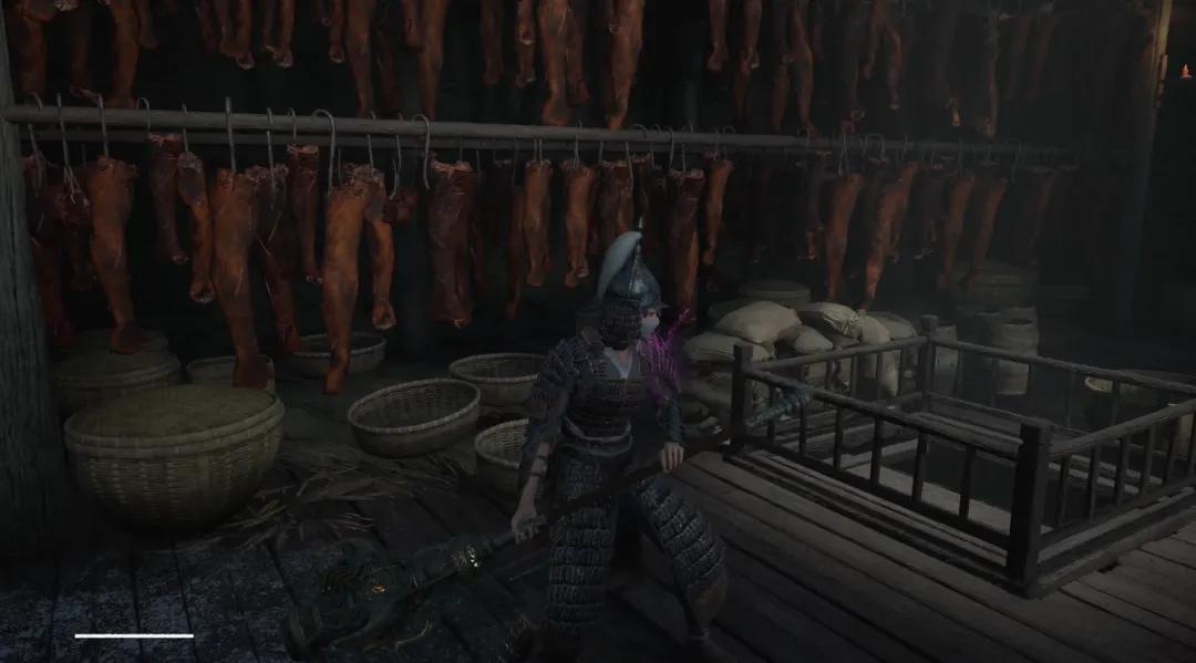 遊戲類似這樣的感覺還有很多,說一個最讓我印象深刻的例子吧:雲頂山上有一片村民房屋,門口掛着過年時纔有的鞭炮,門後的牆上掛滿了風乾煙燻的香腸臘肉,但我仔細一看,我發現那些都是人手人腳。旁邊的雜兵還會說上一句,大意是:肉的問題好解決,但柴火上哪去找?