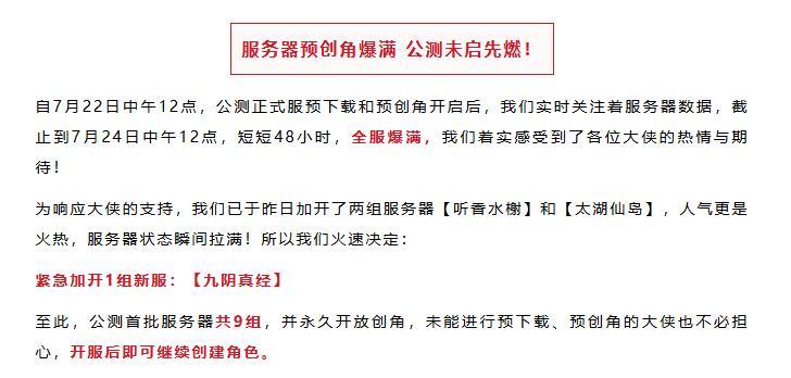 所以昨天連夜加開了【聽香水榭】和【太湖仙島】,結果瞬間又被拉滿。今天更是火速加開了【九陰真經】,現在公測首批服務器已經有9組了!