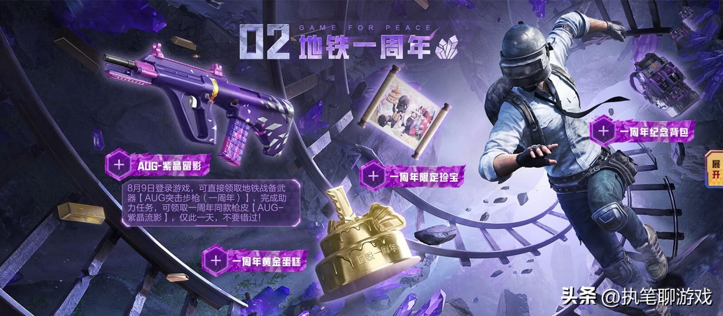 接下來則是地鐵一週年的相關獎勵,比如8.9當天進入遊戲即可領取的AUG以及週年槍皮紫晶流影,同時還有一週年黃金蛋糕、限定珍寶、紀念揹包等。
