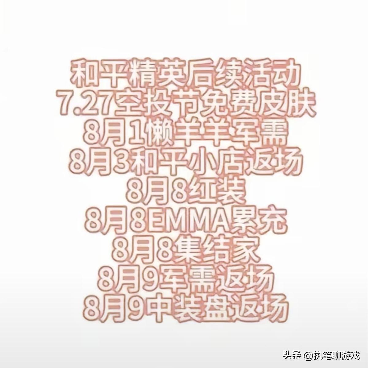 和平小店、軍需、中轉盤的返場,其實早就被光子在“預熱”期間公佈,當時官宣的時間也是8月上旬,結合“驚喜日曆”進行判斷,應該十有八九穩了。