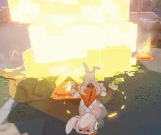 例如兔兔的小技能是在自己的面前放一組盾牌,自己的子彈可以從中間上面的小窗射出去,大招則可以像《堡壘之夜》能直接生成一座像素風的堡壘,直接讓自己與隊友快速登頂,爲自己這一方獲得防禦陣地。