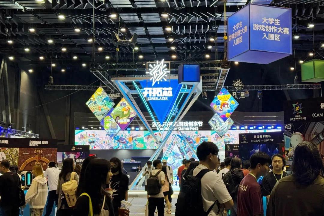 會場中央,一座直通屋頂的開拓芯裝置立在那裏,不少人在周圍交流討論。他們既包含了一些還未畢業的大學生,也有來自各家公司的開發者、發行商、投資商……其中還有不少來自海外,不大的場館裏有着各種語言的交流聲。