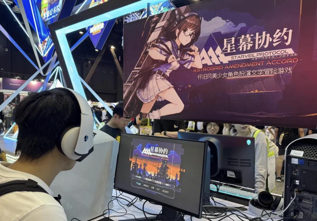 作爲二次元愛好者,我自己還很喜歡展會上一款叫《星幕協約》的遊戲,它是一款主打懷舊畫風、賽博朋克題材的文字RPG,主要玩法結合了文字冒險和跑團要素,美術和實際體驗都很有趣。